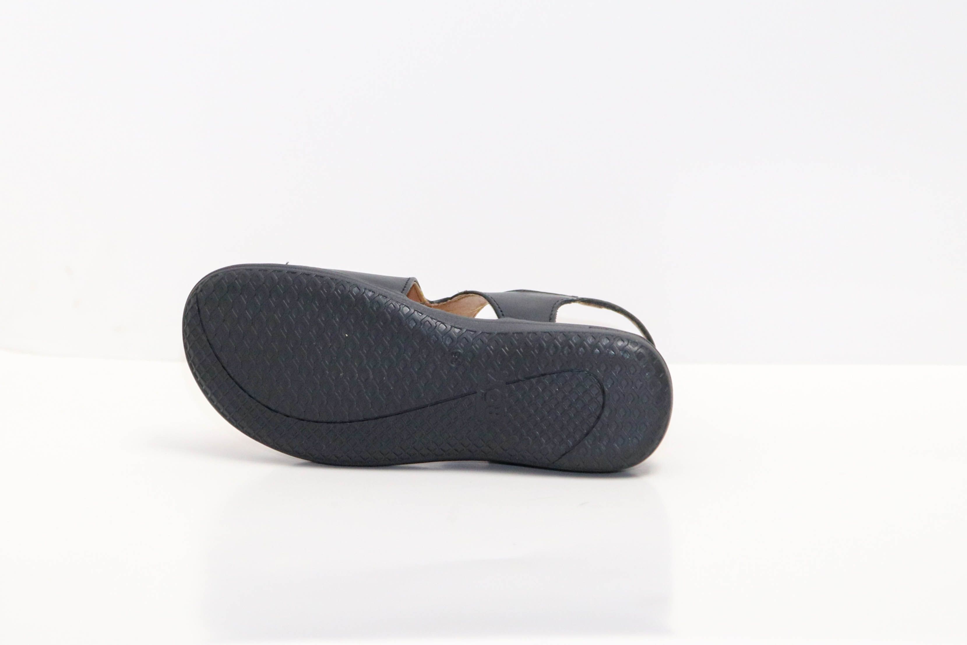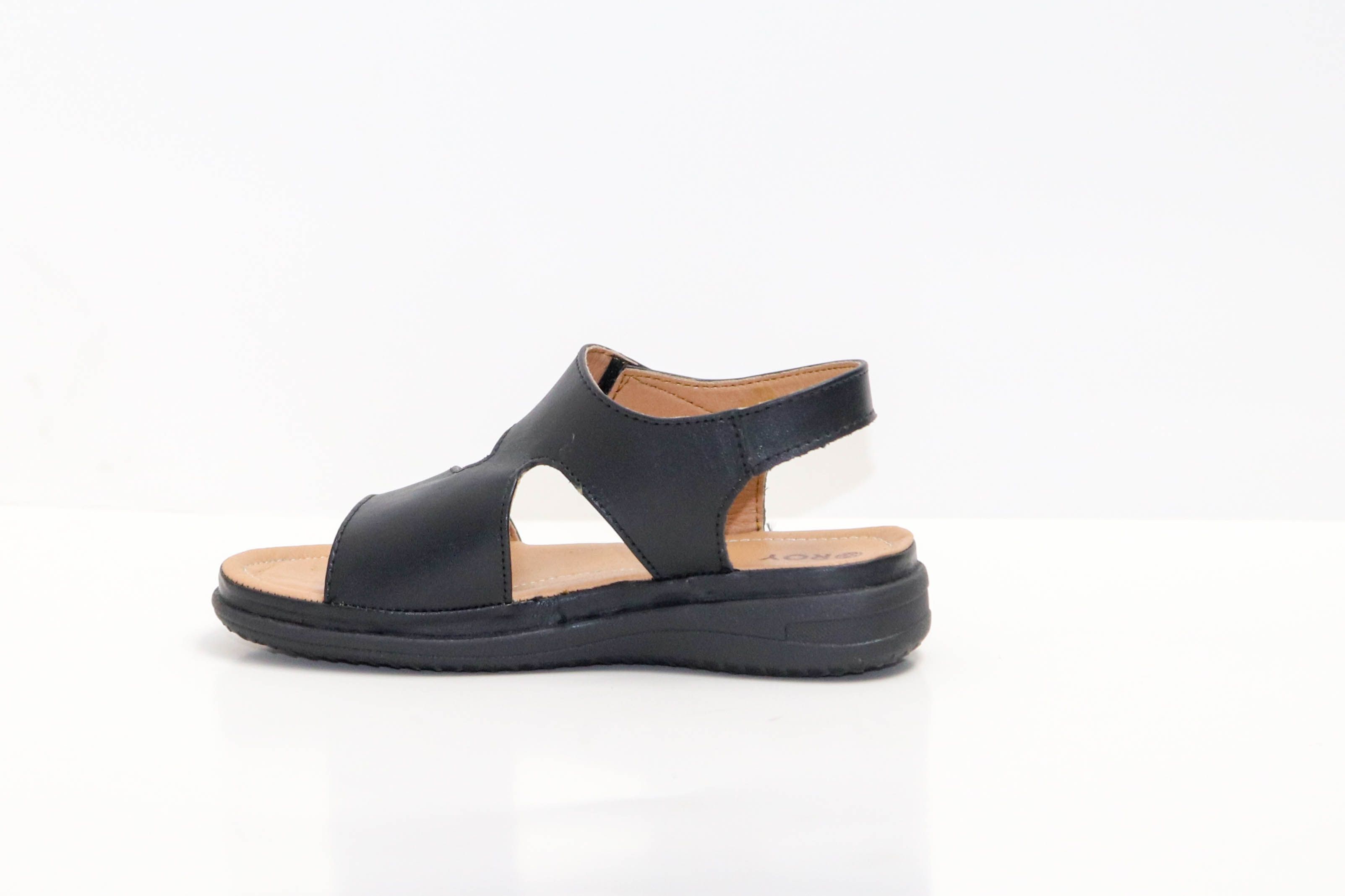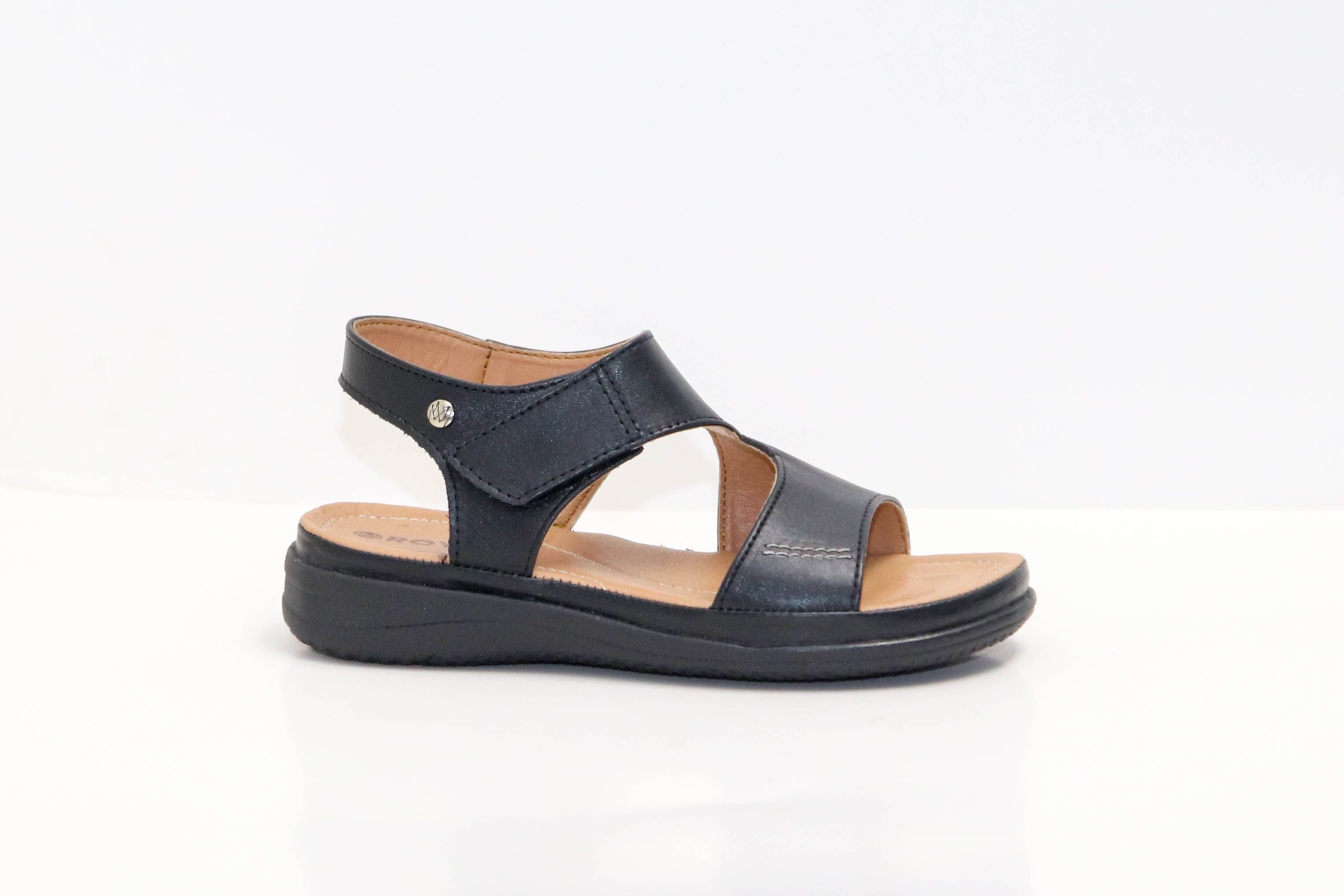 Sandalia casual elaborada en cuero negro con una plantilla de forro de cerdo para mayor comodidad.