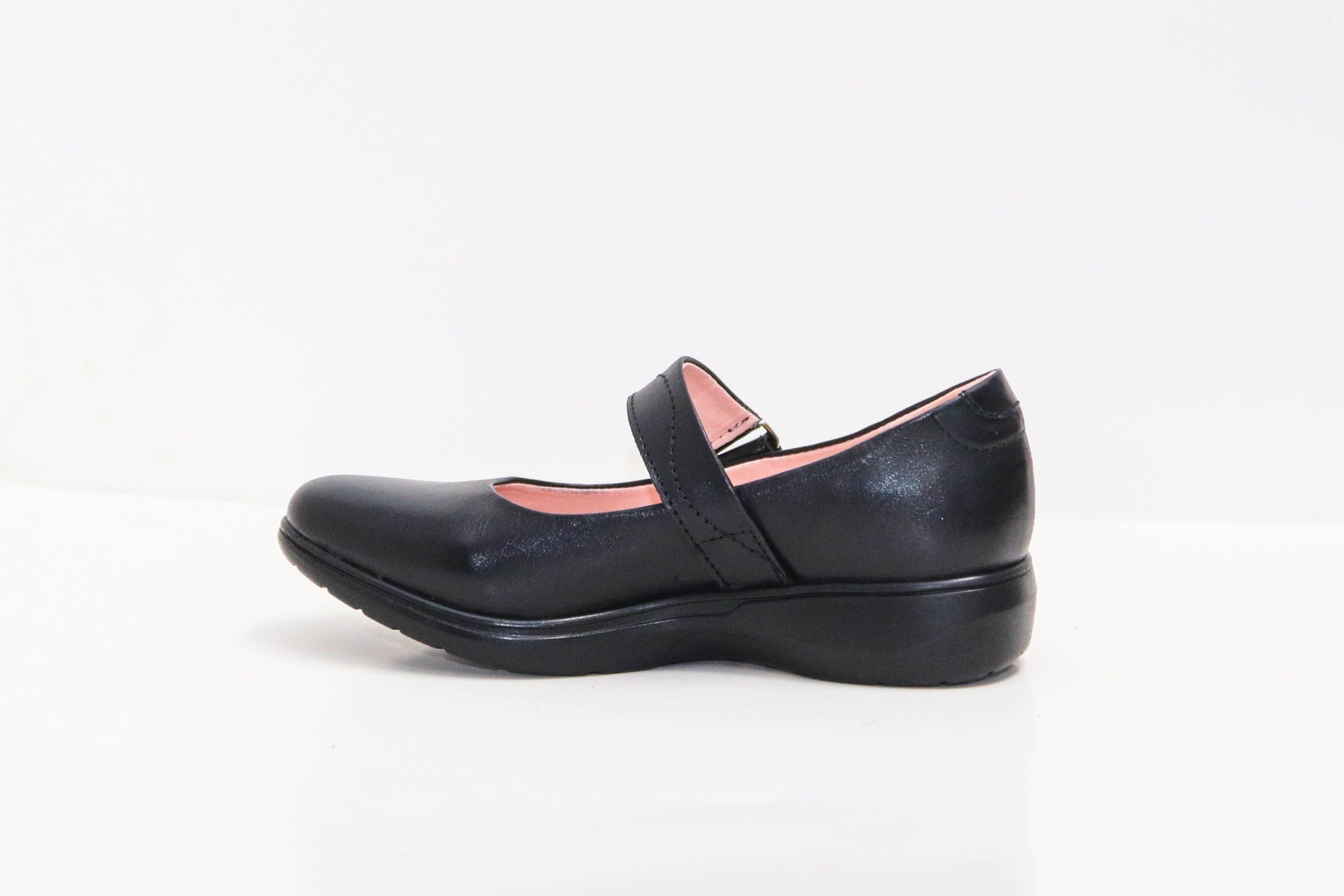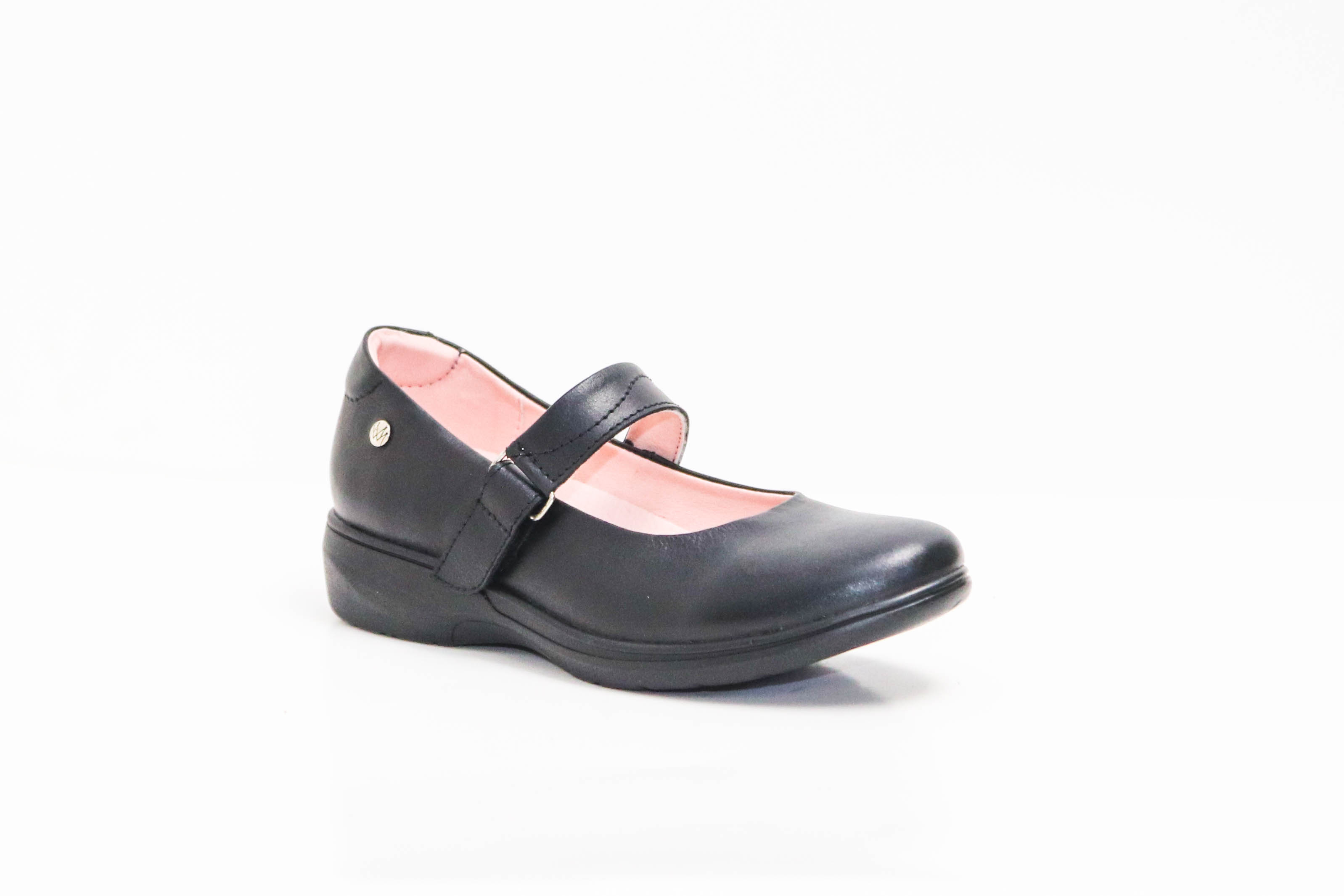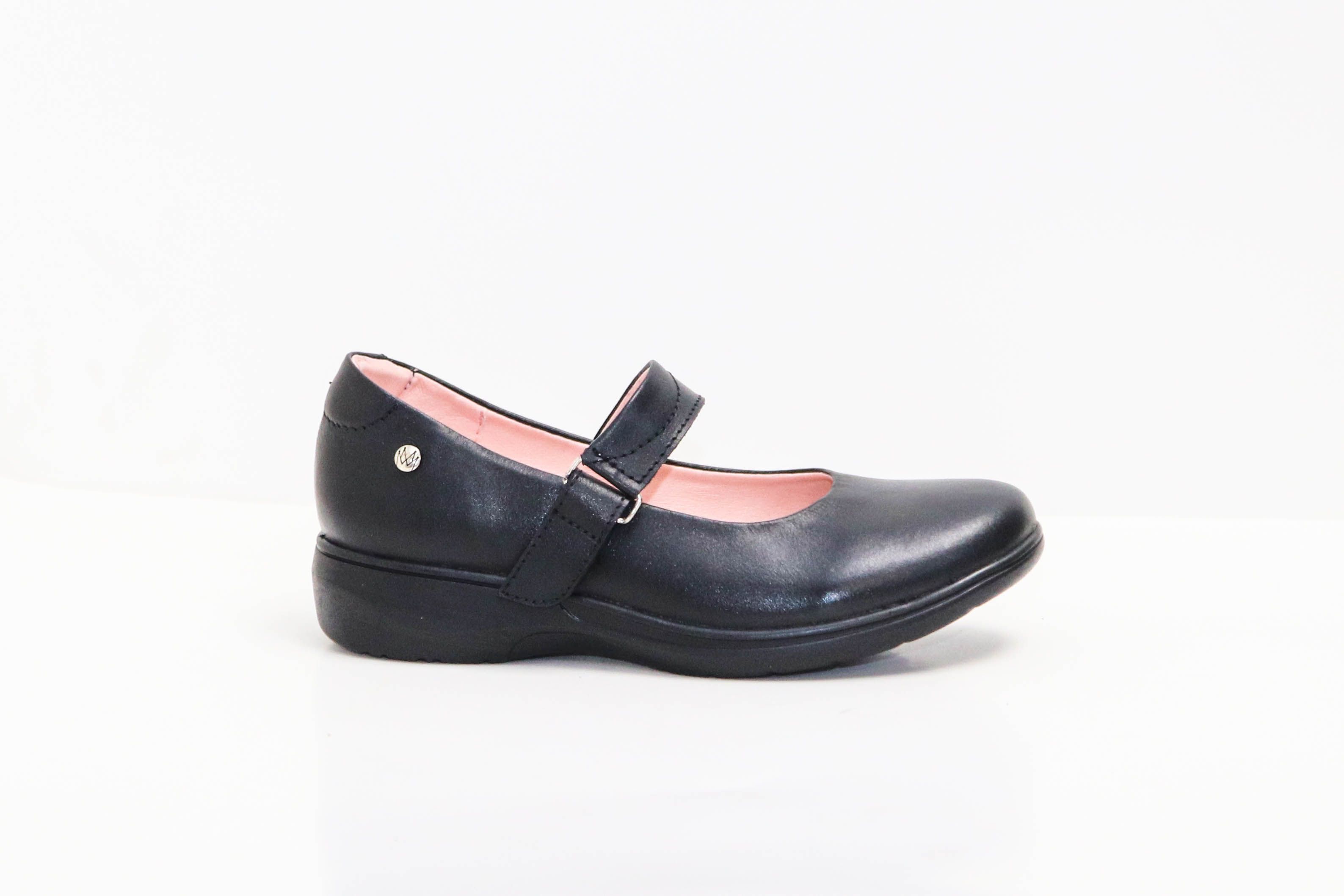 Calzado escolar juvenil, de cuero negro liso lustrable para fácil limpieza. Cincho de velcro ajustable para mayor seguridad y comodidad, forros transpirables y una plantilla de memory foam 3mm color rosado. Con suela P.U. para un mejor confort y amortiguación al caminar.